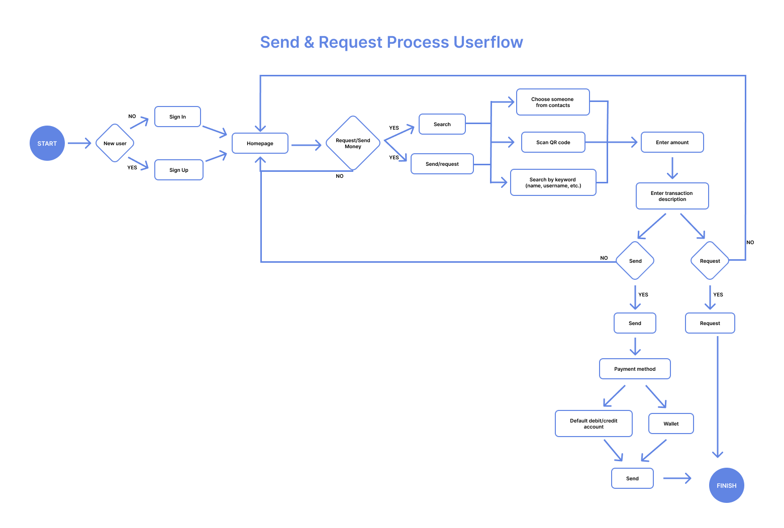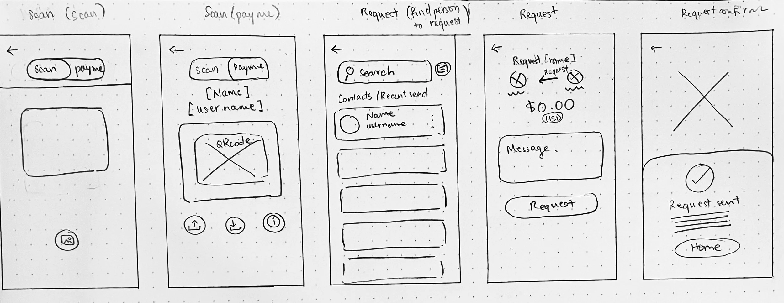 With our goals, users, and features defined, I was ready to start wireframing. I needed to determine how users would navigate the app, so I first mapped out the existing user flow based on the prototype demo to visualize how people would send and request money. This helped our team identify pain points.