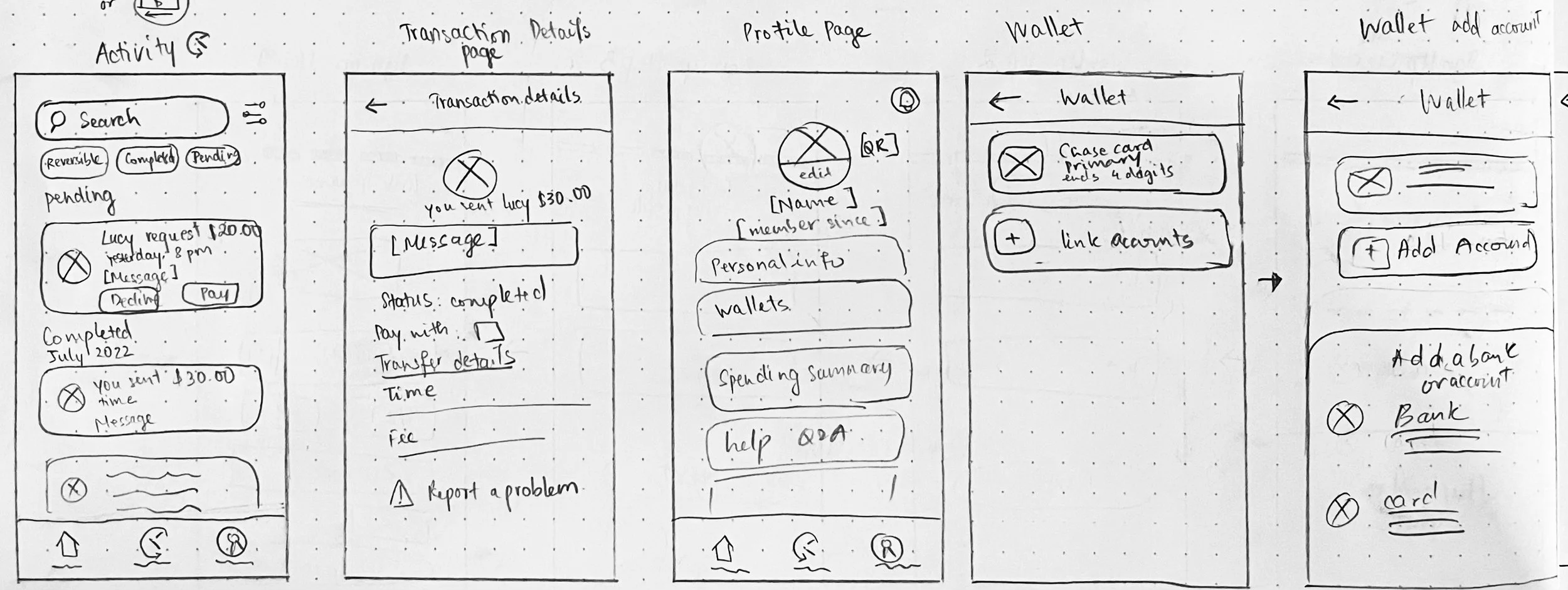 Sketches of Activity, Transaction Detail, Wallet.