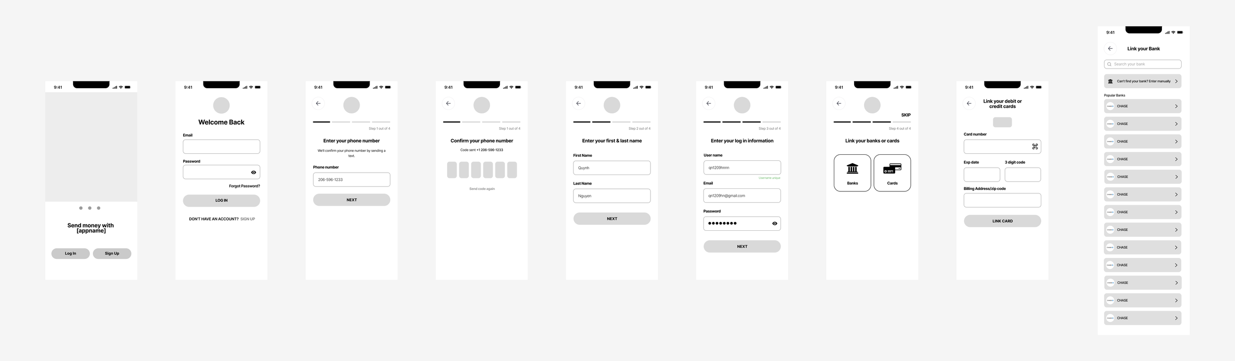 1 - Lo-fi Wireframes of the On-boarding Process.
