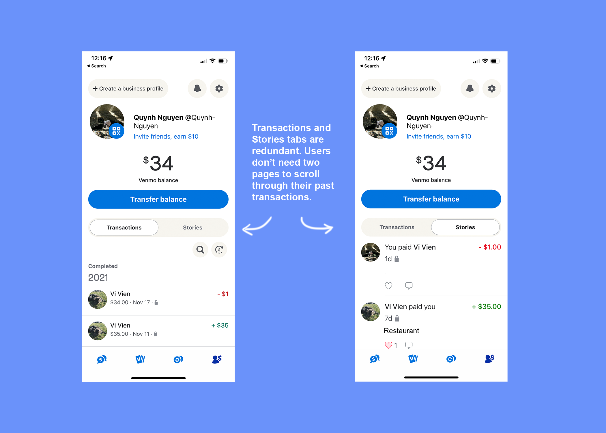 Users can't search for past transactions without scrolling through the users' profile's social feed (stories).