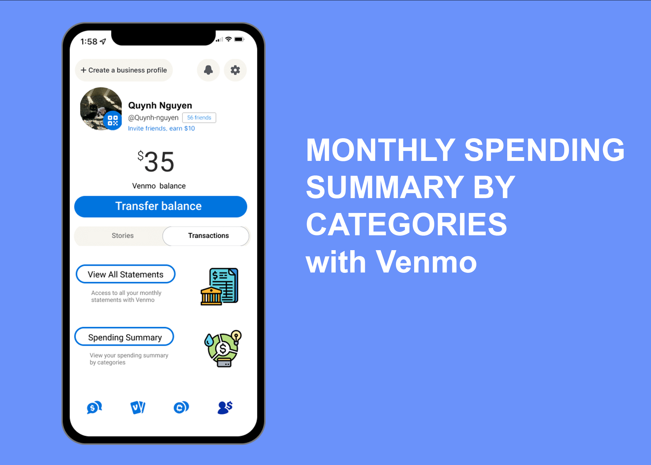 Based on the current version of the Venmo app (9.7.0), there is no spending summary and users are demanding Venmo to have this feature available for non-Venmo credit/debit card users. The outcome of having this feature encourages Venmo users to use the app to pay in-store, pay shared bills, or do online shopping.